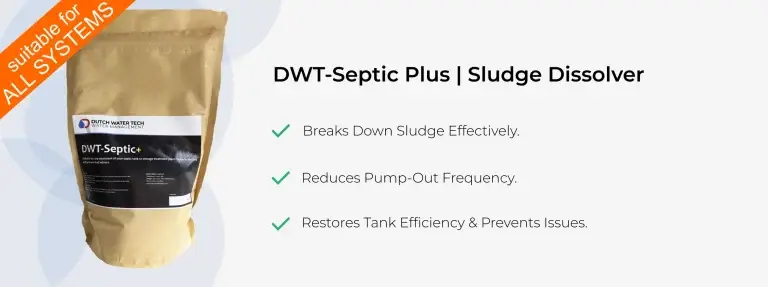 Looking for a powerful sludge dissolver? We recommend DWT-Septic Plus. This potent product contains a high concentration of bacteria that rapidly break down the sludge layer in your tank—without odor. These bacteria are suitable for all wastewater systems.